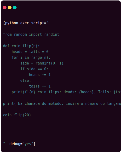 Na chamada do método, insira o número de lançamentos de moeda no formato: coin_flip(n).