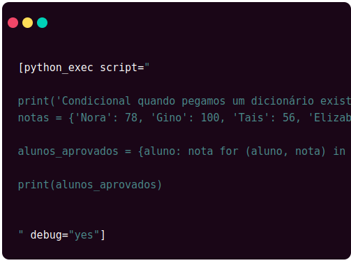 Condicional quando pegamos um dicionário existente e criamos um novo dicionário apenas com os alunos que receberam uma nota de aprovação maior que ou igual a 60